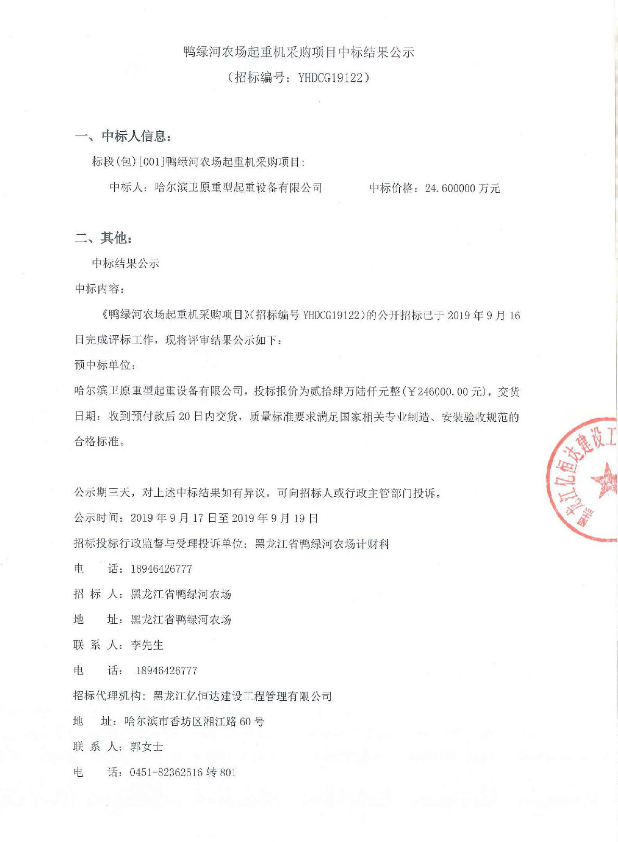 鴨綠河農(nóng)場起重機(jī)采購項(xiàng)目中標(biāo)結(jié)果公示