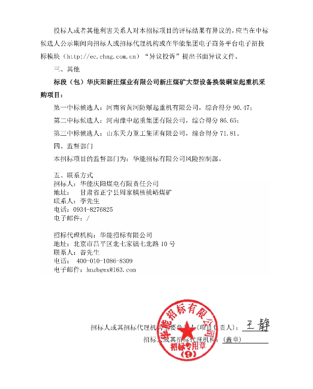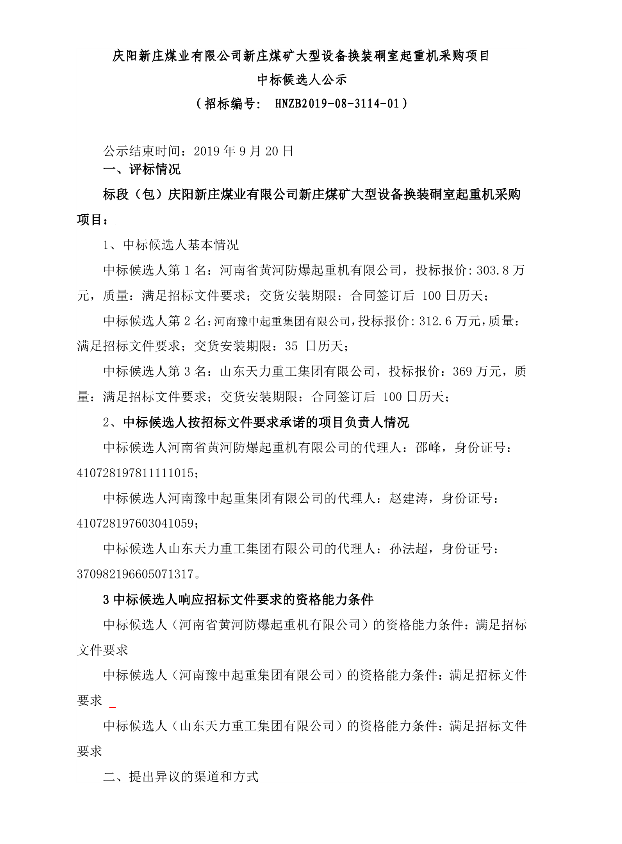 移動版:慶陽新莊煤業(yè)有限公司新莊煤礦大型設備換裝硐室起重機采購項目中標候選人公示