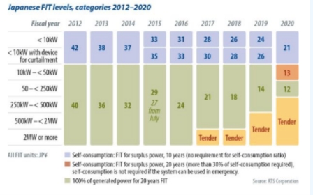 自2020年4月也就是日本最新財(cái)政年度的第一個(gè)月開始,新的上網(wǎng)電價(jià)政策開始生效:其中關(guān)鍵的變化是新政策的費(fèi)率和對規(guī)模從10 kW到50 kW的光伏系統(tǒng)的自我消耗要求,以及參加投標(biāo)的項(xiàng)目容量下限從之前的500 kW降低到了250 kW。