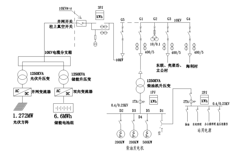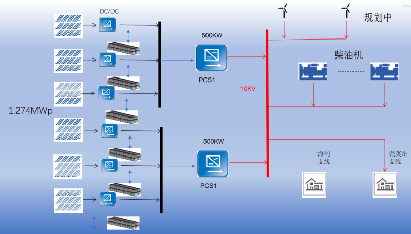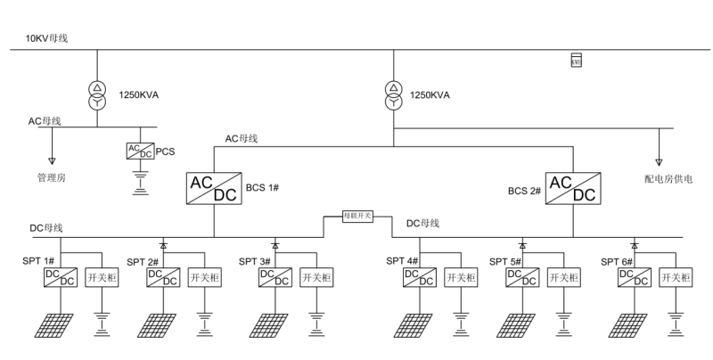 光伏系統(1.274MWp)與儲能系統(7.239MWh)總直流母線連接,并由2臺BCS逆變器升至400Vac交流母線,并經0.4/10.5kV升壓變升壓至10kV輸電線路接入用戶側。