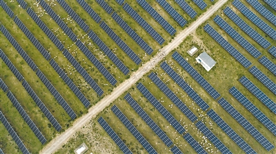 羊群在青海省海南藏族自治州共和光伏產業園吃草。新華社記者 吳剛 攝