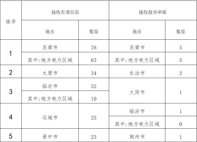 各地市按照收到的有效信息數量排序,呂梁市、太原市、臨汾市、運城市、晉中市等列轄區內前5位;按照投訴舉報數量排序,呂梁市、長治市、大同市、臨汾市、朔州市等排在轄區內前5位。(2020年6月有效信息及投訴舉報排名前5位情況見表三)