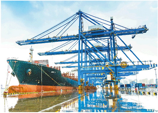 7月13日,隨著“尼克斯”輪緩緩靠泊,山東港口青島港到中東的又一條快線正式開通。(□記者肖芳報道)