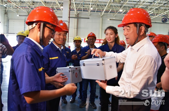 天氣雖然炎熱,安全生產(chǎn)絕不能忘!徐工一線職工嚴守作業(yè)標準,佩戴安全帽、手套、面罩等安全防護用品。現(xiàn)場,周鐵根悉心詢問了他們的工作環(huán)境、作息時間,叮囑他們注意身體,要勞逸結(jié)合,并向堅守在生產(chǎn)一線的職工代表們發(fā)放了清涼包、醫(yī)藥箱、安全教育書籍等物資。