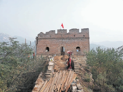 秋意漸濃,延慶區大莊科鄉、八達嶺鎮長城段敵臺上,工人們正擼起袖子加緊施工。預計本周,今年啟動的2號、66號、90號敵臺搶險加固工程全面完成。屆時,延慶區26.6公里磚石長城96座空心敵臺中,82座完成修繕或搶險加固,搶險率達85%。