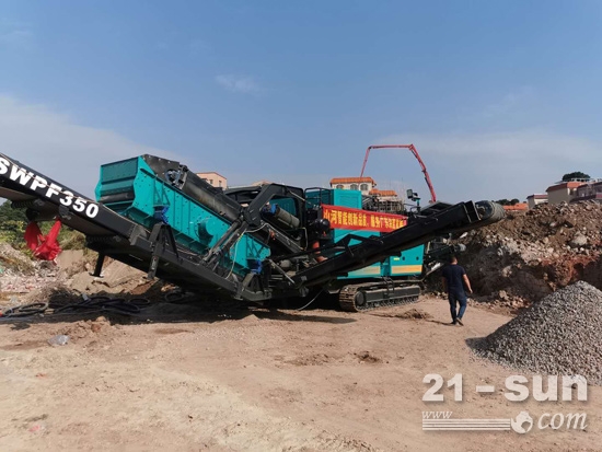 這臺(tái)設(shè)備的主要工作就是對(duì)現(xiàn)場的巖石、混凝土塊等建筑廢料進(jìn)行破碎,它的胃口大到一小時(shí)可以“吞”下350噸廢料。吞下去的廢料在其體內(nèi)破碎后,很快就能變成可回收利用的沙子和石塊,從另一頭的履帶上“吐”出來。