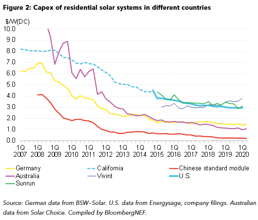 此外,稅收抵免還為主要的發電商和其他中介機構創造了一個市場,從而抬高了房主的最終價格,同時在加利福尼亞州和大多數其他活躍的美國太陽能市場上仍提供了5-8年的投資回收期。美國資本支出高的一個相對較小的因素是美國模塊的進口關稅,這意味著美國客戶通常為模塊支付0.33美元/瓦,而其他市場為0.21美元/瓦或更低。