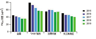 2013年以來,中國在經濟持續增長、能源消費量持續增加的情況下,環境空氣質量總體改善。2019年,全國PM2.5平均濃度較2015年下降了20%。重點區域PM2.5濃度和重污染天數大幅減少,以京津冀及周邊地區“2+26”城市為例,2019年PM2.5濃度較2015年下降28%,重污染天數減少45%,以PM2.5為首要污染物的天數下降了44%;北京市PM2.5濃度由81微克/立方米下降到42微克/立方米,重污染天數由43天下降至4天。