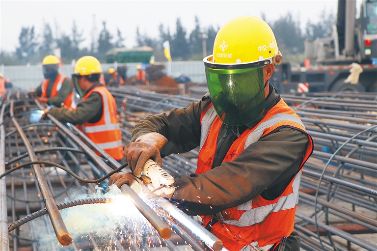 在其中一個鋼筋加工區(qū),楊光建和工友們戴著面罩和橡膠手套,正一起焊接12米長的鋼筋籠。