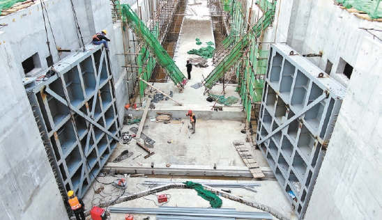 水泥鋼筋構成的堅固閘室上下游方向,四對鋼鐵閘門已經安裝到位。每一對閘門又分為兩扇。相關負責人介紹,每扇門在出廠時都是兩截,施工方現場完成焊接后再進行吊裝作業。“吊裝閘門就位只是安裝工作的起點,真正的難點在調試。”