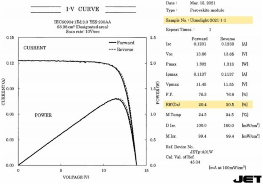 據(jù)悉,極電光能制備的鈣鈦礦光伏組件,經(jīng)過全球權(quán)威測(cè)試機(jī)構(gòu)JET(日本電氣安全環(huán)境研究所)嚴(yán)格檢測(cè),達(dá)到了20.5%的光電轉(zhuǎn)換效率,為目前全球范圍內(nèi)大面積鈣鈦礦組件效率的最高紀(jì)錄,對(duì)于光伏未來發(fā)展有著重要意義。