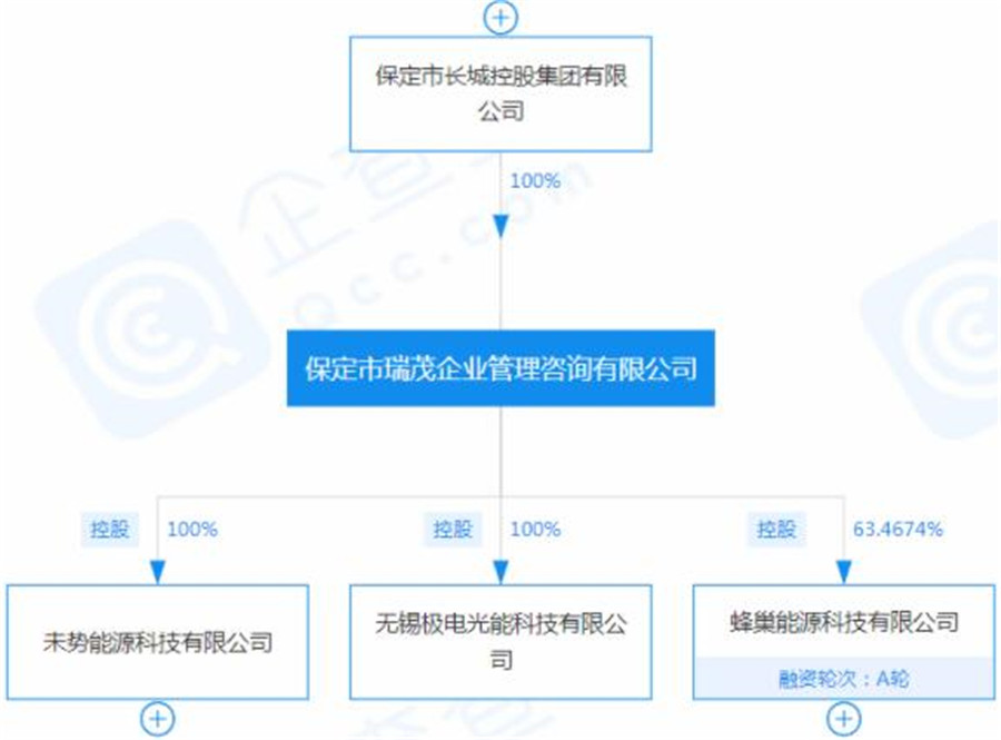 這就要從極電光能背后的控股公司開始說起。據(jù)企查查數(shù)據(jù)顯示,極電光能是保定市長(zhǎng)城控股集團(tuán)有限公司(下稱“長(zhǎng)城控股”)旗下全資孫公司,通過保定市瑞茂企業(yè)管理咨詢有限公司進(jìn)行控股。