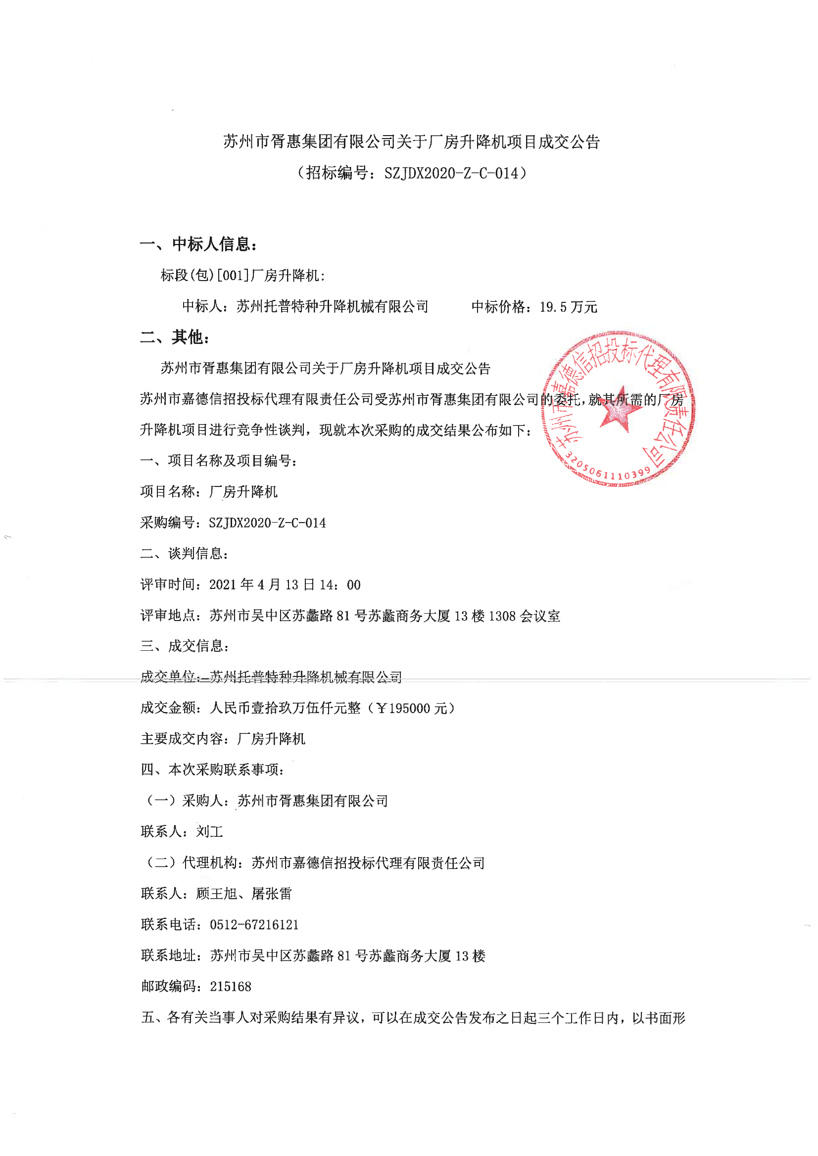 移動版:江蘇:蘇州市胥惠集團有限公司關于廠房升降機項目成交公告