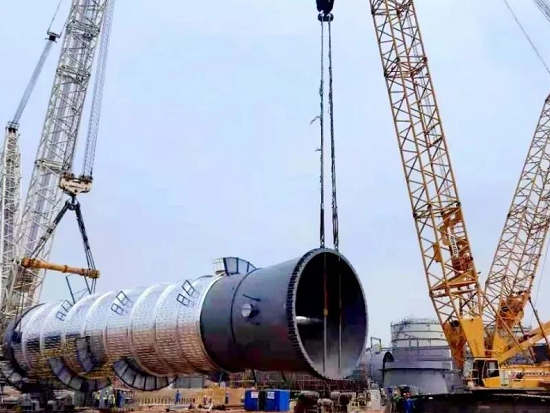 此次吊裝采用1250噸履帶吊為主吊,450噸履帶吊溜尾,歷經2小時設備順利就位。按項目規劃,今年5月底前將完成核心塔器的安裝工作。