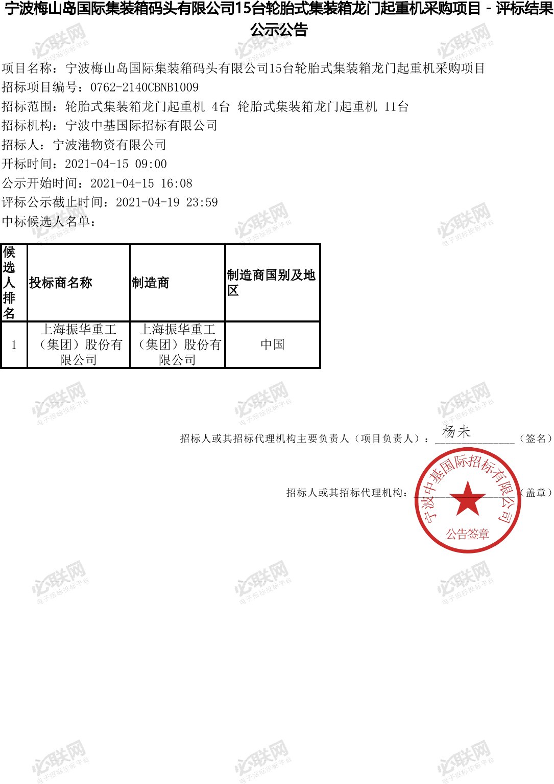 寧波梅山島國際集裝箱碼頭有限公司15臺輪胎式集裝箱龍門起重機采購項目中標公告 SWF文件鏈接