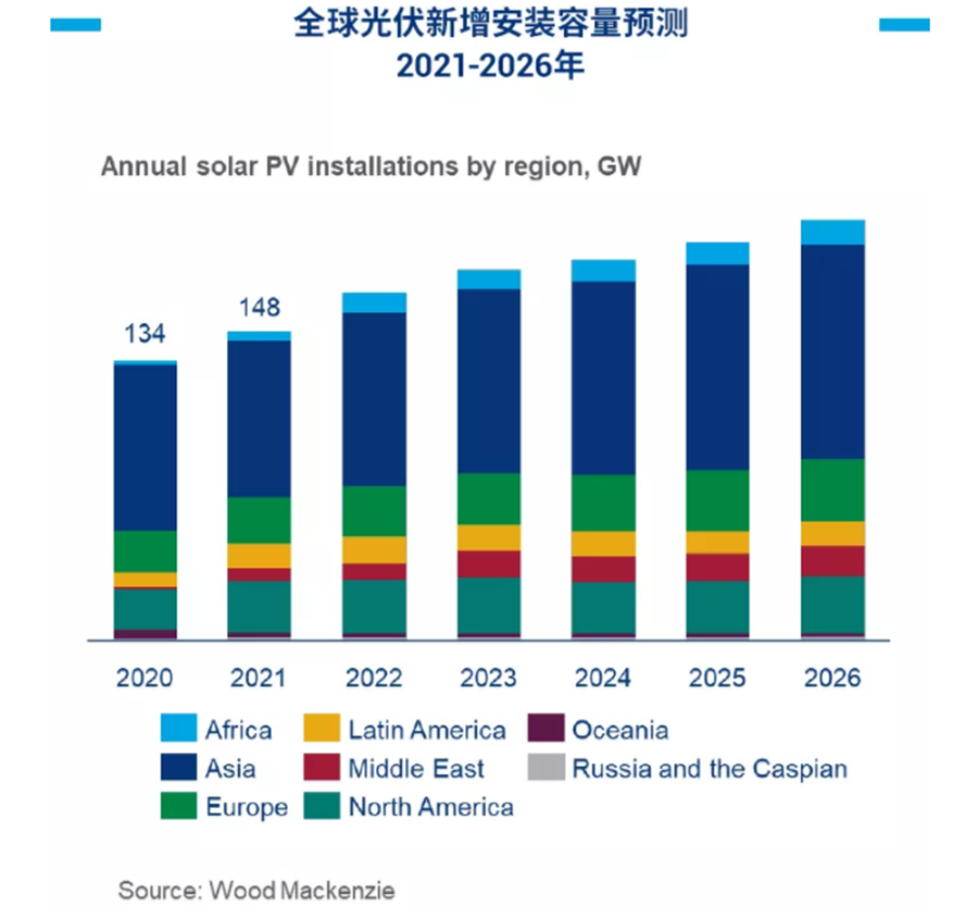 據(jù)伍德麥肯茲最新預(yù)測(cè),2021年將繼續(xù)蓬勃發(fā)展,預(yù)計(jì)安裝容量將實(shí)現(xiàn)148 GW,同比增長(zhǎng)11%。未來(lái)五年的復(fù)合年均增長(zhǎng)率為7%。2026年度新增容量或?qū)⑼黄?00GW大關(guān),而距離2019年突破首個(gè)100GW年度增量大關(guān)僅耗時(shí)7年。