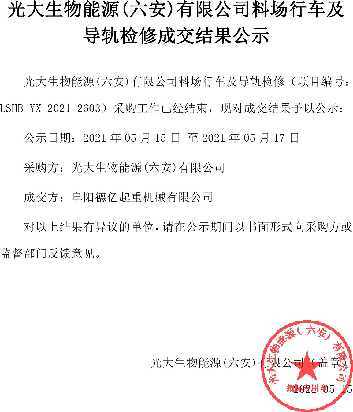 移動版:安徽:光大生物能源(六安)有限公司料場行車及導軌檢修成交結果公示