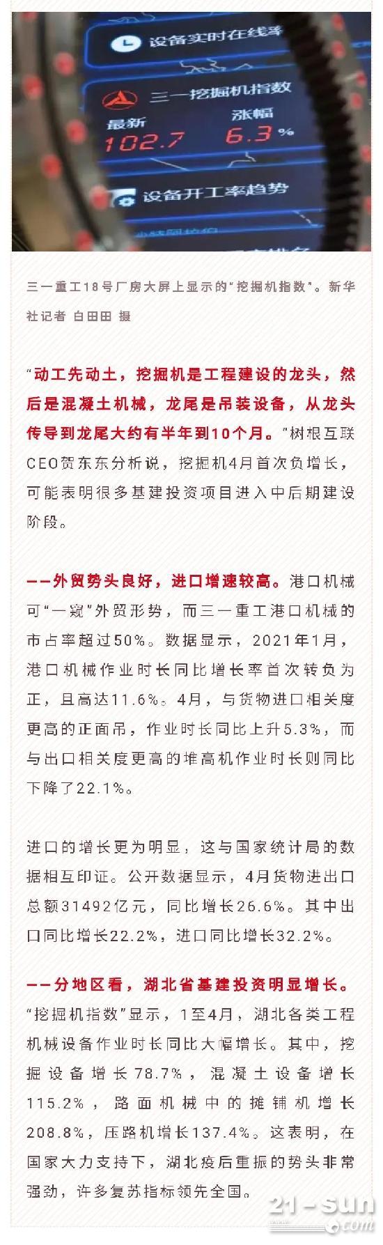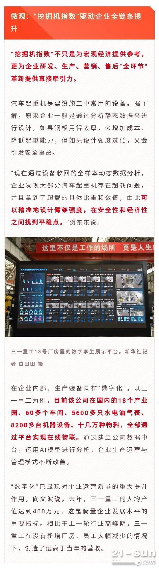 海量設備投放市場后收回的大數據,正在為“中國制造”轉型升級和高質量發展提供“內驅力”。由此生成的“挖掘機指數”,即時上報國家有關部委,則成為宏觀調控的重要參考。