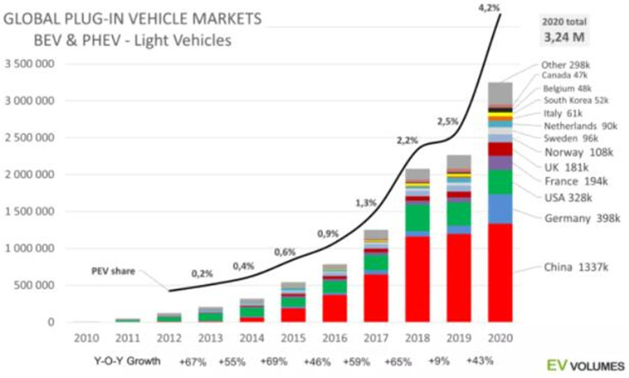 新能源汽車從2011年開始嶄露頭角,其中插電式混合動力汽車(Plug-in hybrid electric vehicle,簡稱PHEV)、純電動車(Battery Electric Vehicle,BEV)在2020年全球銷售量達到了324萬輛,其中按地區來算,中國占比最大,達到了133.7萬輛,占全球新能源汽車市場的41.27%。