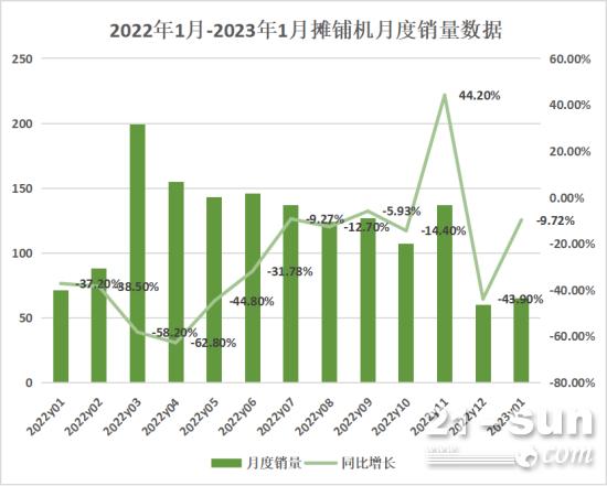 據我國工程機械工業協會對13家攤鋪機制作企業計算,2023年1月當月出售各類攤鋪機65臺,同比下降9.72%。