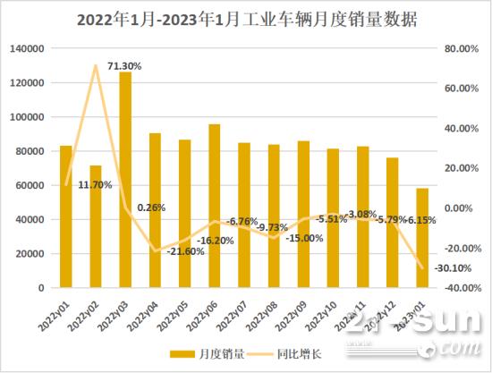 據我國工程機械工業協會對33家叉車制作企業計算,2023年1月當月出售各類叉車58124臺,同比下降30.1%。