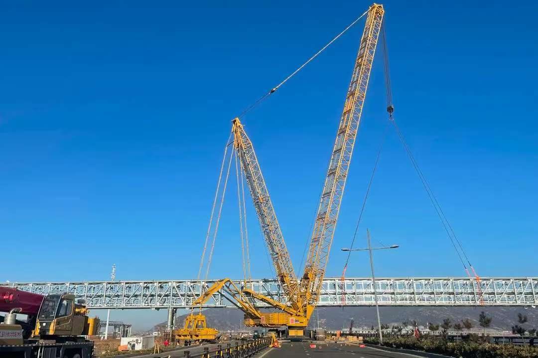 該項目包含五段鋼結(jié)構(gòu)構(gòu)件,其中CD段跨熱力管道需趴臂調(diào)整角度,EF段長90米約170噸重,對機械、人員協(xié)調(diào)配合有較大考驗。在吊裝開始前,項目部組織了多次專家評審,根據(jù)現(xiàn)場施工條件以及地基承載力驗算,最終確定采用1000噸履帶吊進(jìn)行鋼結(jié)構(gòu)吊裝作業(yè),施工全過程可控、在控。