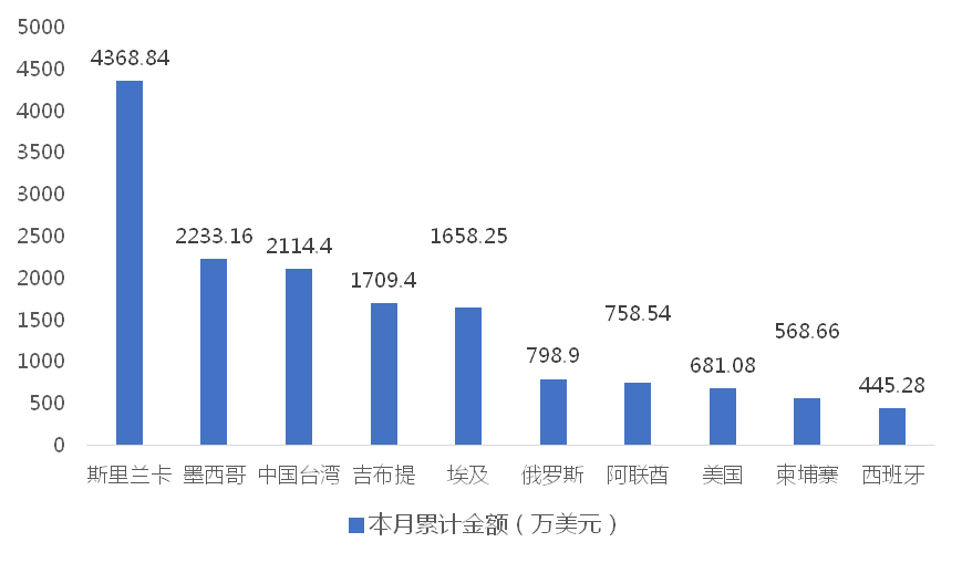 1-4月,我國(guó)龍門(mén)式起重機(jī)出口金額排名前十的國(guó)家/地區(qū)分別為斯里蘭卡、墨西哥、中國(guó)臺(tái)灣、吉布提、埃及、俄羅斯、阿聯(lián)酋、美國(guó)、柬埔寨、西班牙,合計(jì)占我國(guó)該產(chǎn)品出口總額的89.42%。其中,向斯里蘭卡出口最多,金額為4368.84萬(wàn)美元,占出口總額的25.47%。