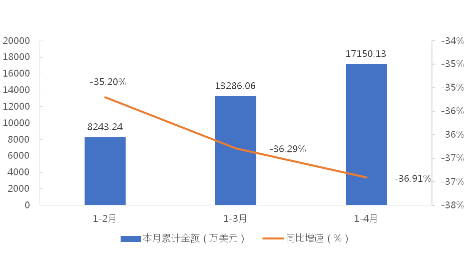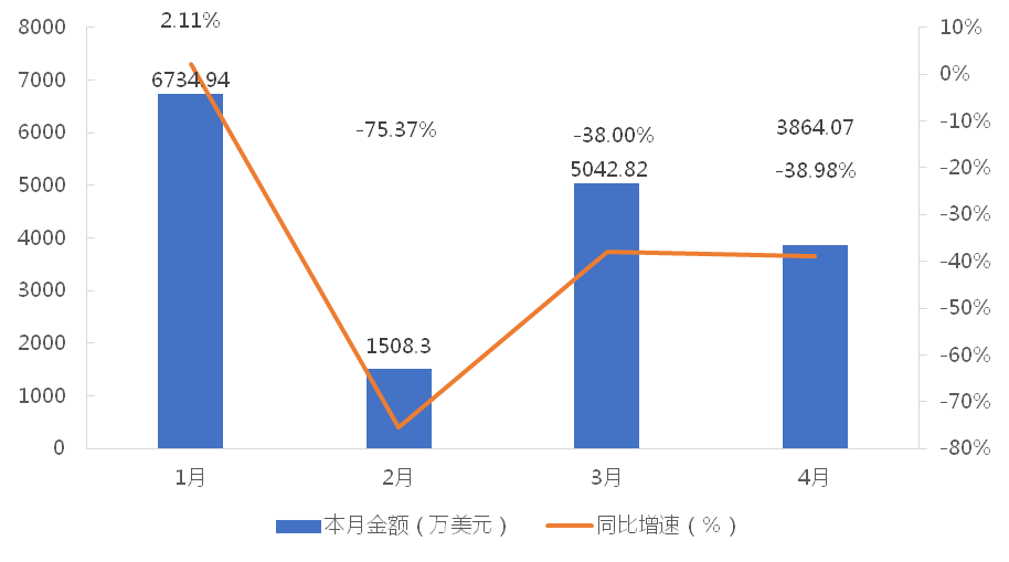 1-4月,我國(guó)龍門(mén)式起重機(jī)累計(jì)出口金額為17150.13萬(wàn)美元,同比下降36.91%;累計(jì)出口數(shù)量為1233臺(tái),同比下降1.04%;出口均價(jià)為13.91萬(wàn)美元/臺(tái),同比下降36.25%。