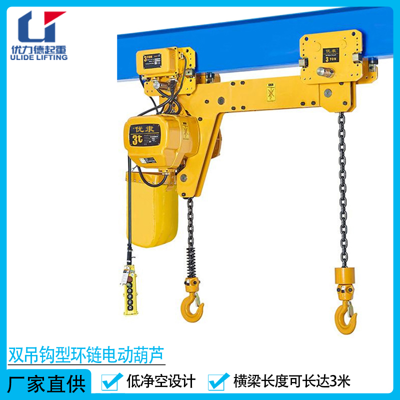 雙吊鉤型環鏈電動葫蘆采用低凈空設計,有效提高了貨物的起升空間;